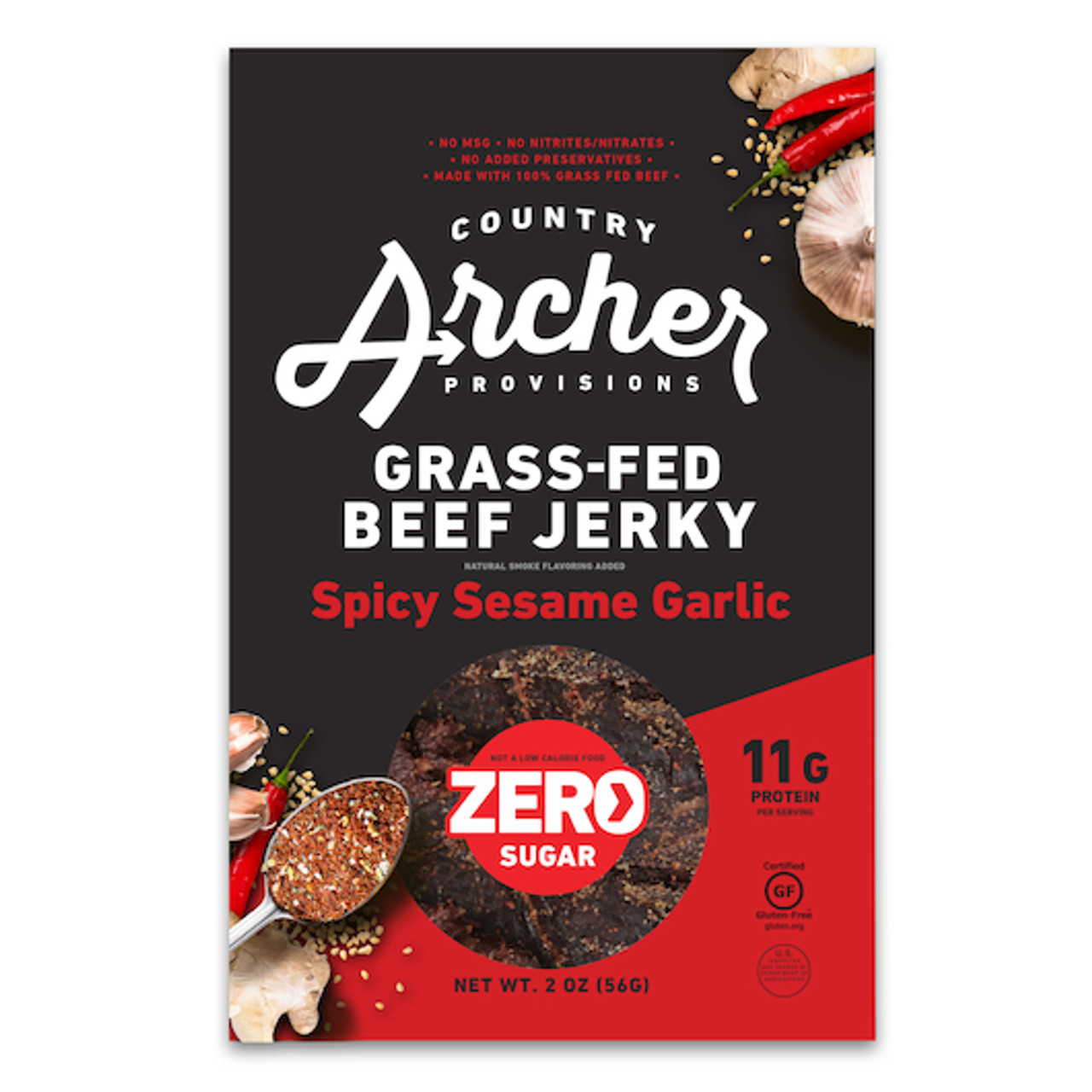 Country Archer Jerky Co Zero Sugar Spicy Sesame Garlic Grass-Fed Beef Jerky, 2 Ounce, 12 Per Case